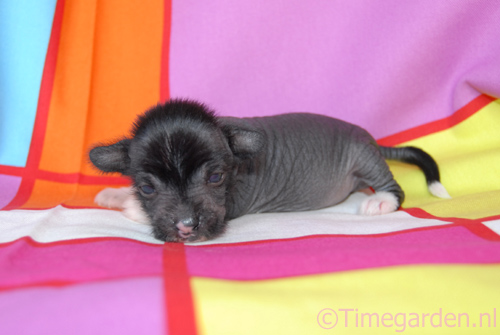 Tiffy is een heerlijk doldwaas true hairless teefje. Ze heeft energie voor tien en werkelijk niets is haar te gek. Een klein wervelwindje met een geweldige persoonlijkheid. Ze zal later agility gaan beoefenen met haar nieuwe eigenaresse en ik weet nu al dat ze daar super veel plezier aan gaat beleven